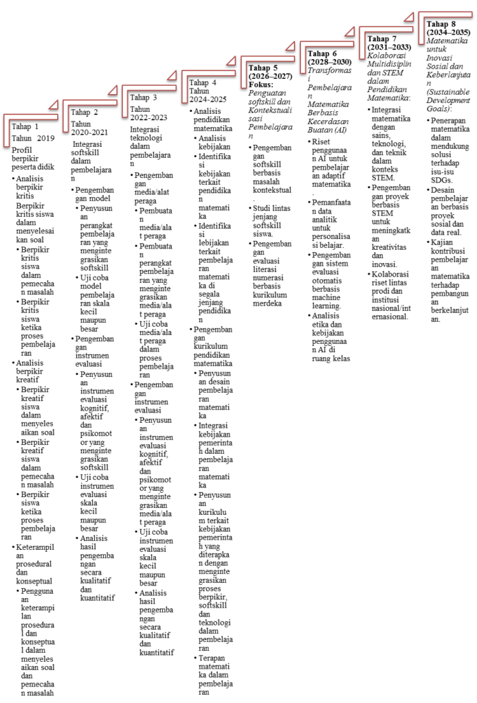 Kegiatan penelitian didukung oleh dosen dengan kepakaran yang relevan dan beragam dalam bidang pendidikan matematika, yaitu: Pemodelan Statistika, Soft Skills (Kreativitas) dalam Pembelajaran Matematika, Berpikir Reversible Matematis, Promote Action Guru Matematika, Argumentasi Matematis, Pembelajaran Pengajuan Pertanyaan Matematis. Berikut adalah bagan road map penelitian program studi Pendidikan matematika program magister: